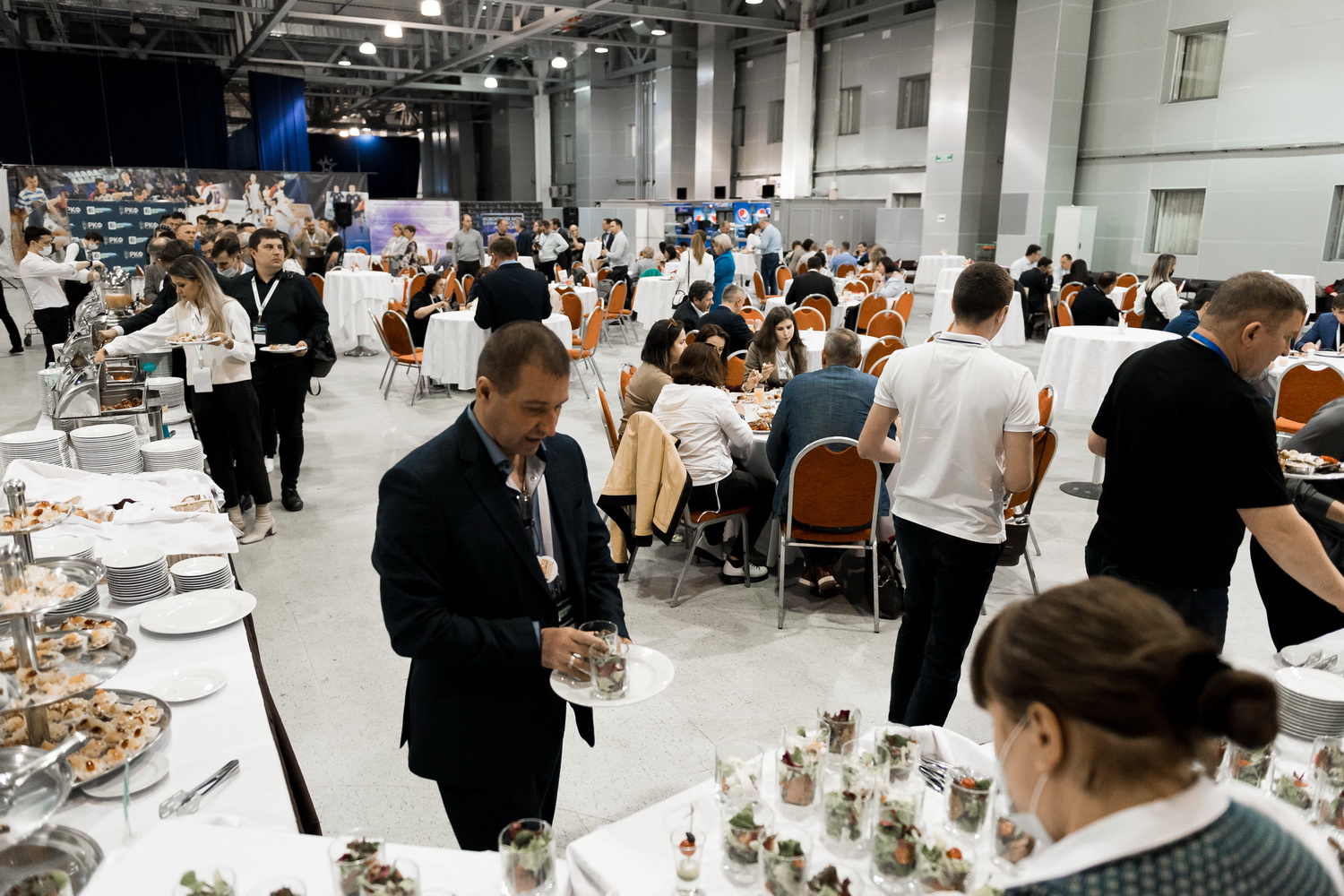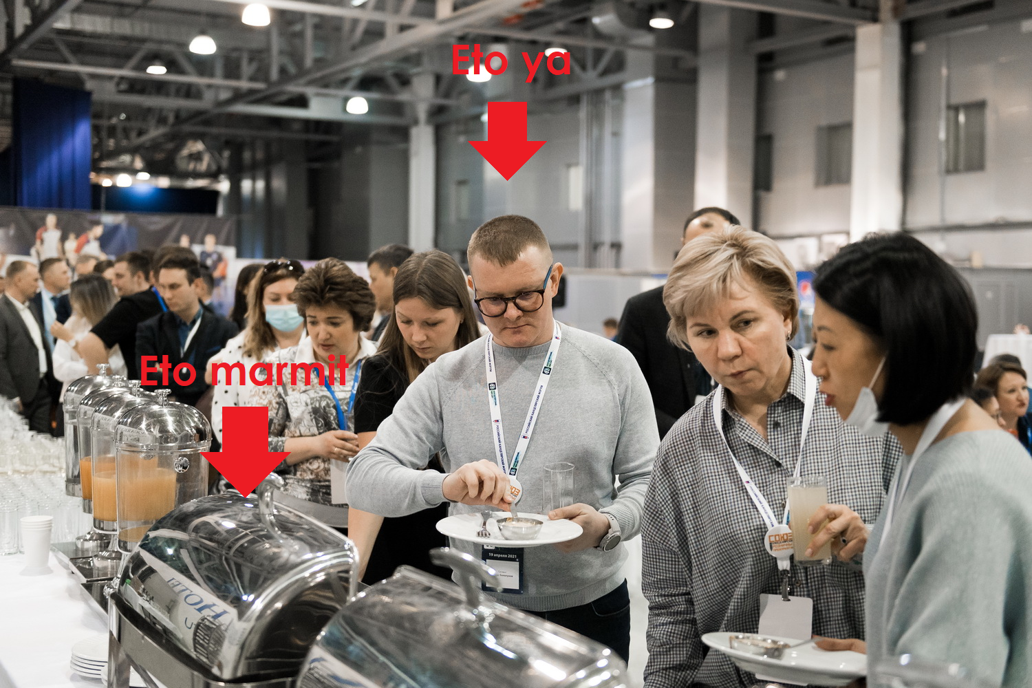 Утренний перекус, обед и ужин никак не продумали. Я понимаю, что этот момент был продиктован местом и форматом проведения. Однако то, как получилось, получилось так себе. Было место для приёма пищи. Была еда. А вот организации всего этого не было. Вариант быстро накидать еду в тарелку, сесть за стол и поесть — отсутствовал. По логике организаторов, участники конференции должны были подходить к шведскому столу, накладывать в тарелку желаемое и садиться есть. Но из-за того, что посетителей было много, всё сломалось. Теперь, чтобы поесть, сначала нужно было найти стол или место за ним, занять его, выстоять длинную очередь перед коротким столом с блюдами и только потом поесть. В итоге получилось так, что по периметру столовой к шведскому столу длинной змеёй продвигалась стихийно организованная очередь. А внутри этой очереди, как в окружении, ели счастливчики, пришедшие раньше других, занявшие места и отстоявшие эту самую очередь. Ну, токое.