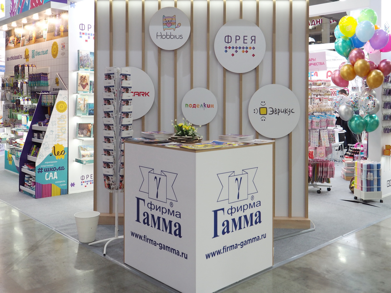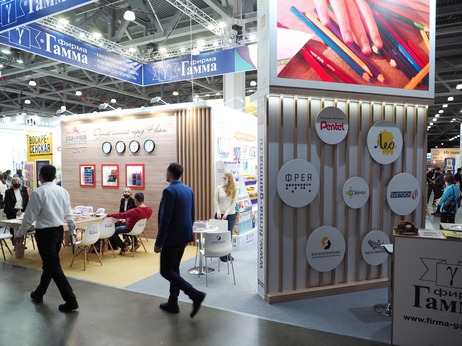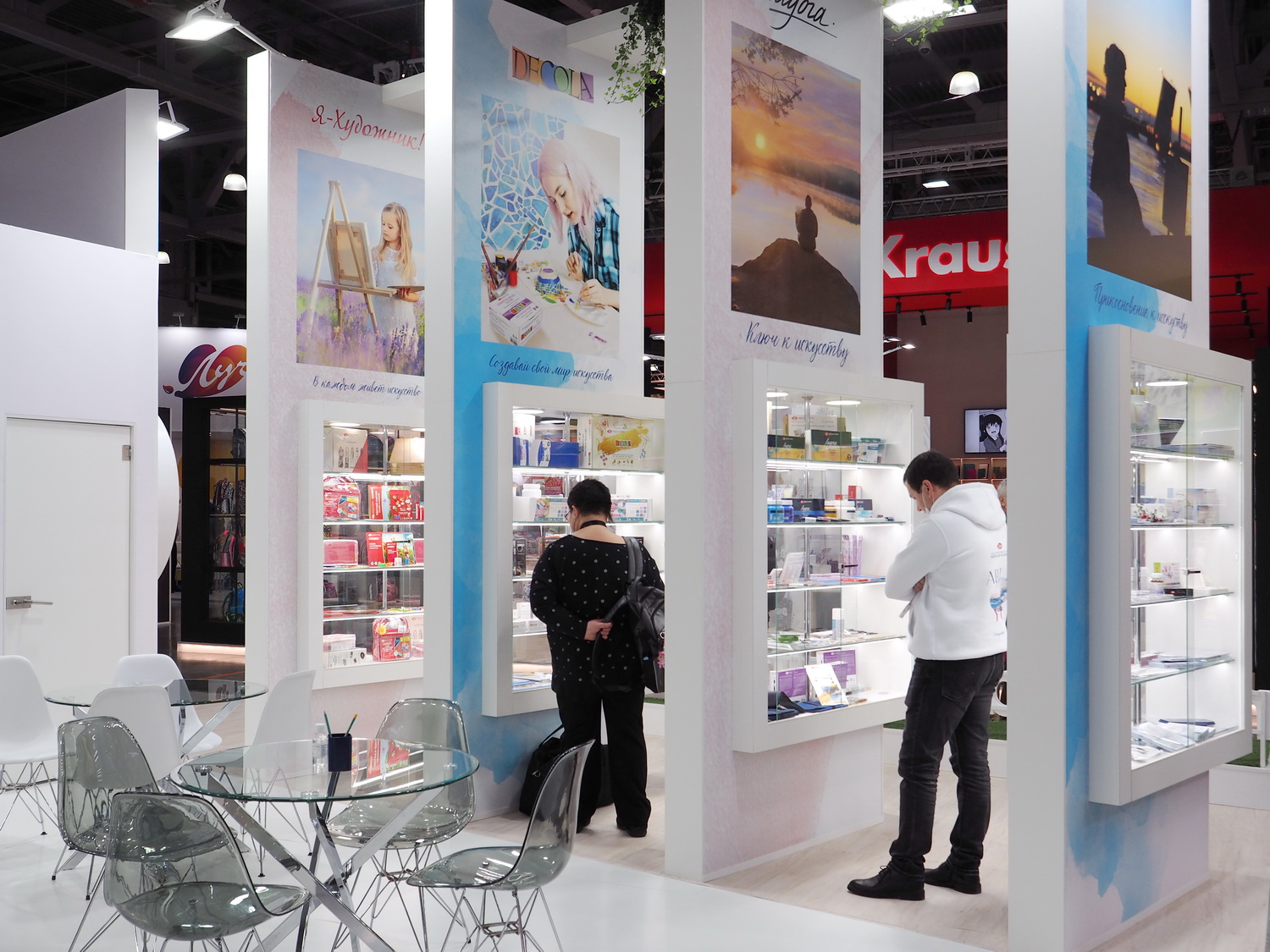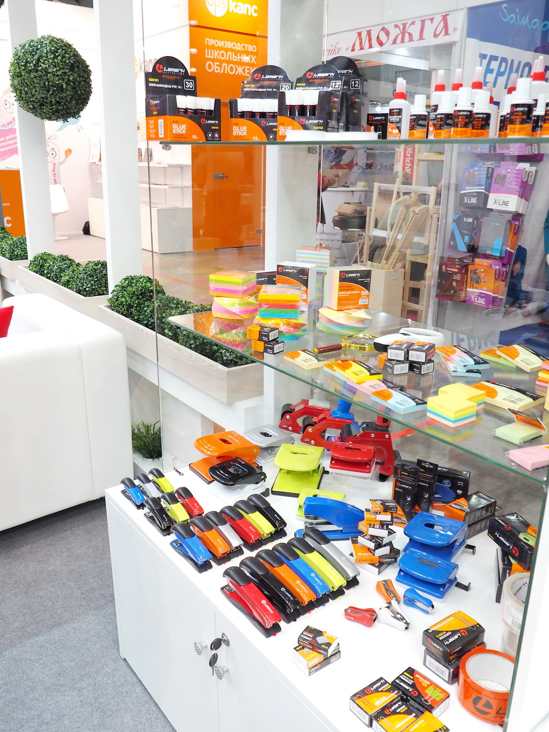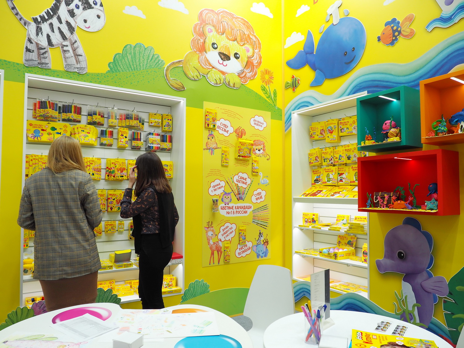 Стенд сегментированный и яркий. У компании разноплановая продукция: здесь выкладка офисного ассортимента, там — школы, тут — творчества. И пусть количество продуктовых групп не так широко, как, например, на стенде «Фирмы Гамма», но, возможно, их наполнение более глубокое.
