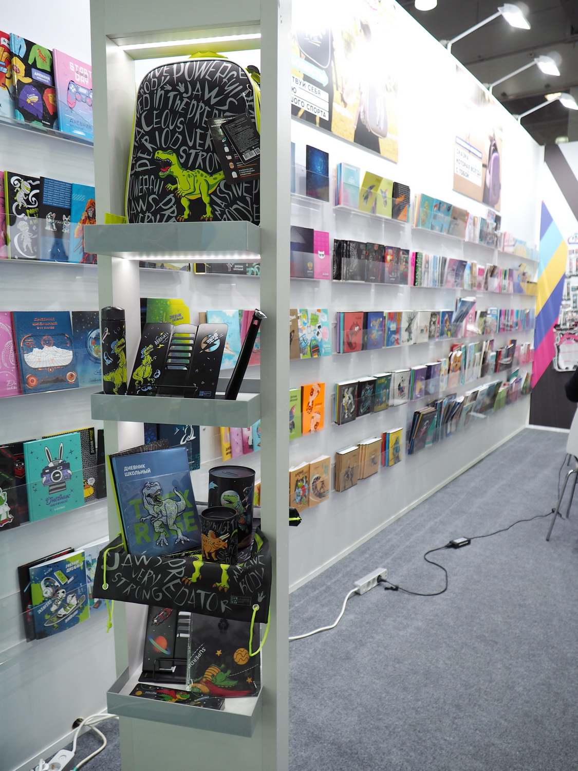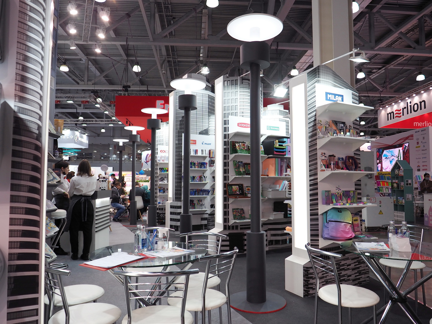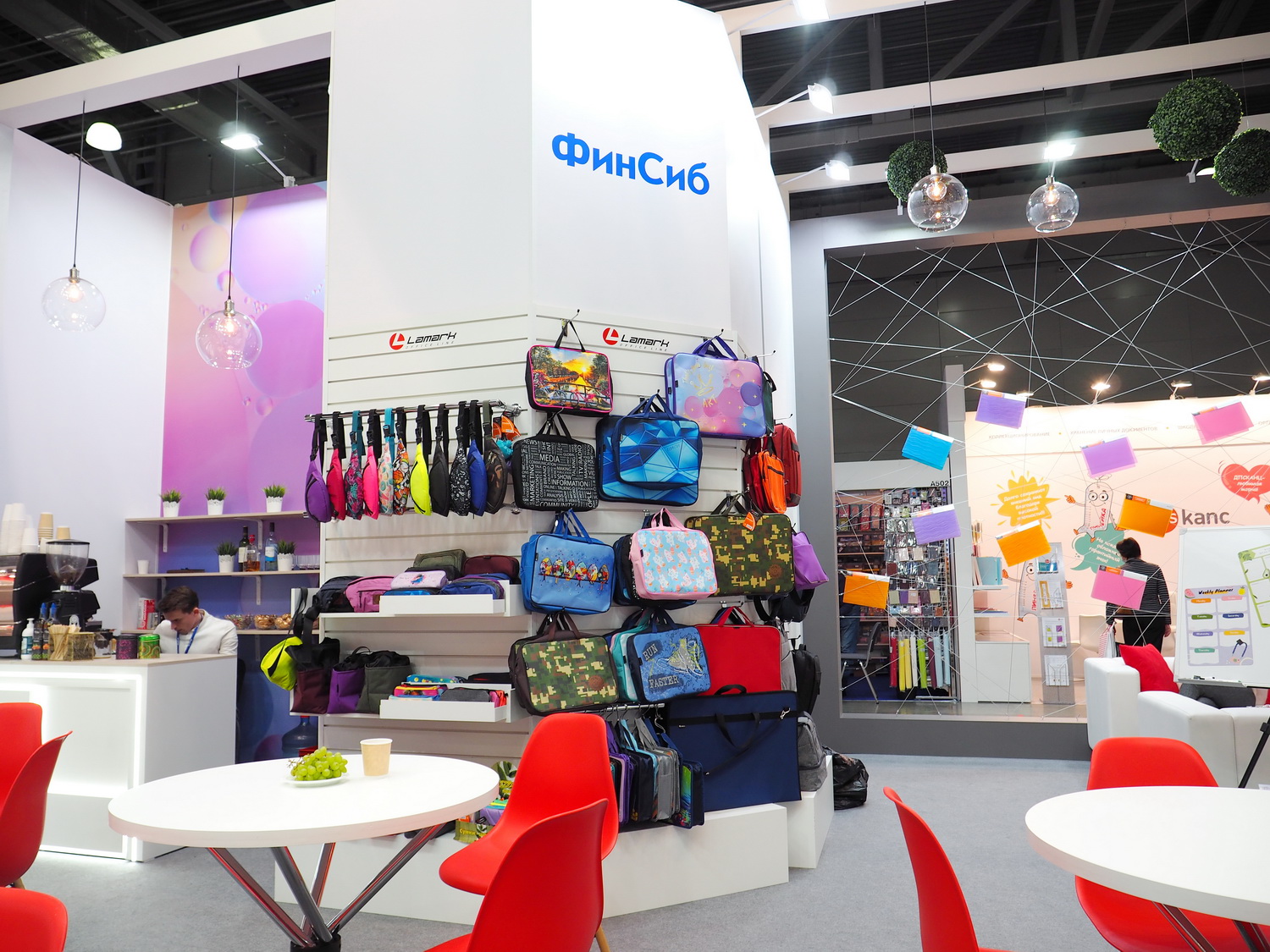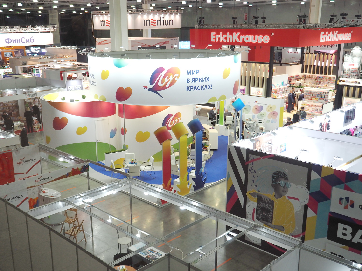 Стенд сегментированный и яркий. У компании разноплановая продукция: здесь выкладка офисного ассортимента, там — школы, тут — творчества. И пусть количество продуктовых групп не так широко, как, например, на стенде «Фирмы Гамма», но, возможно, их наполнение более глубокое.