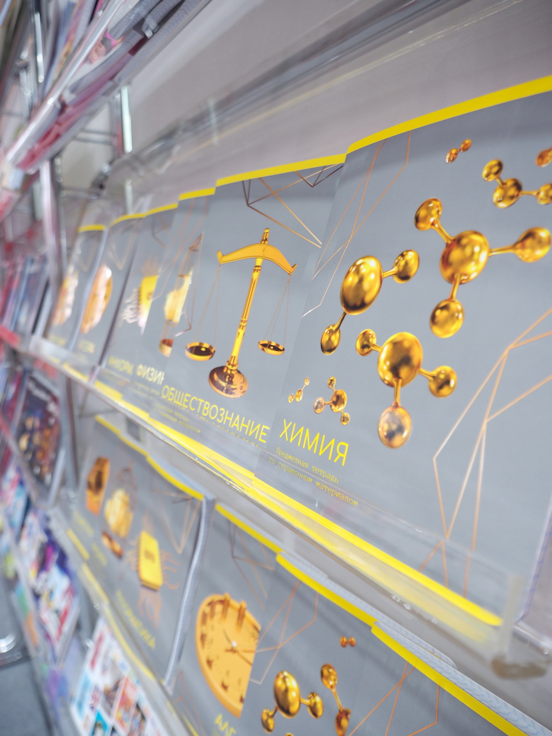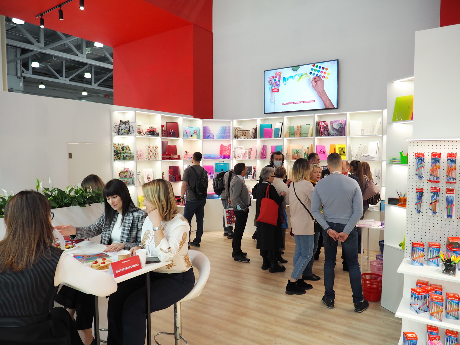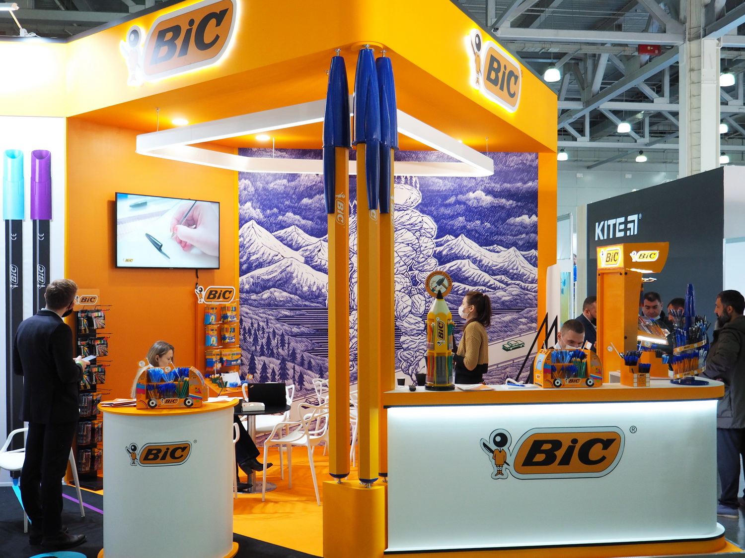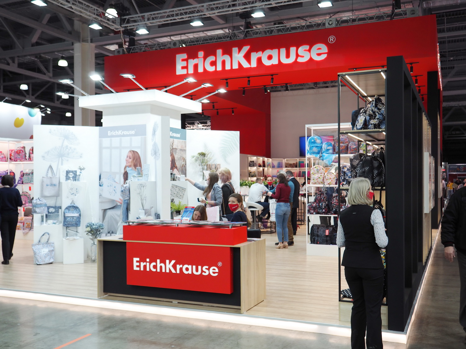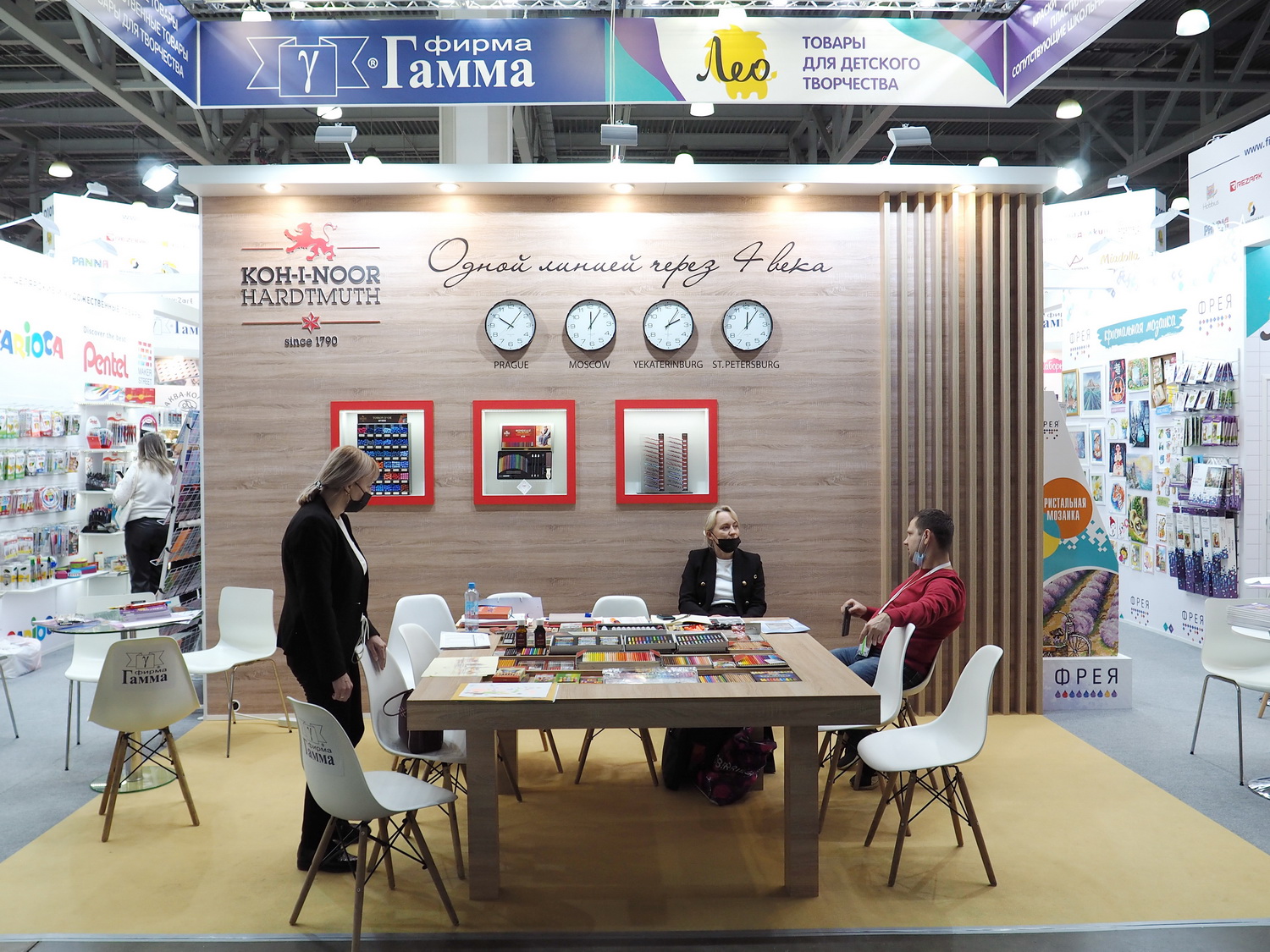 Стенд сегментированный и яркий. У компании разноплановая продукция: здесь выкладка офисного ассортимента, там — школы, тут — творчества. И пусть количество продуктовых групп не так широко, как, например, на стенде «Фирмы Гамма», но, возможно, их наполнение более глубокое.