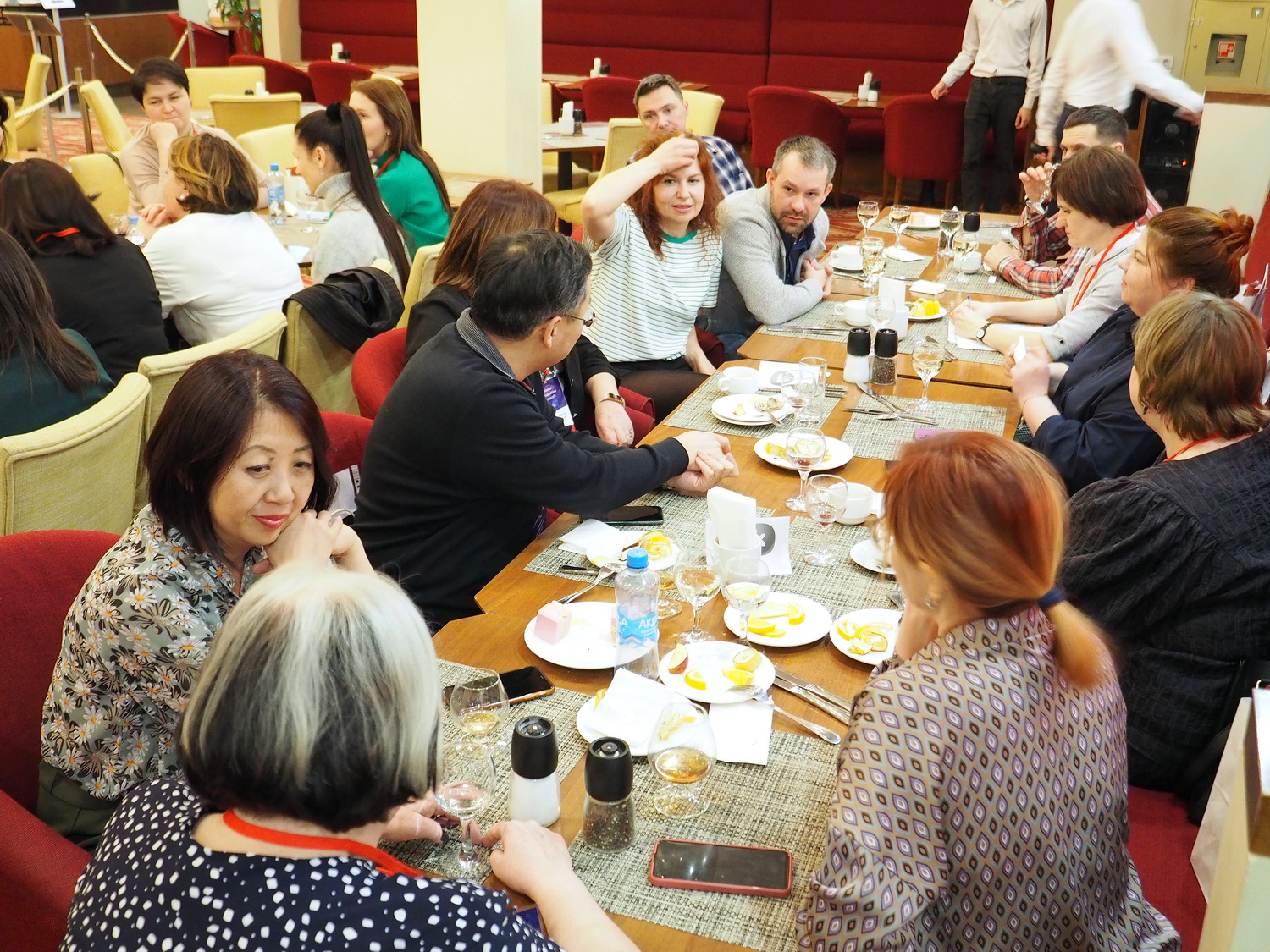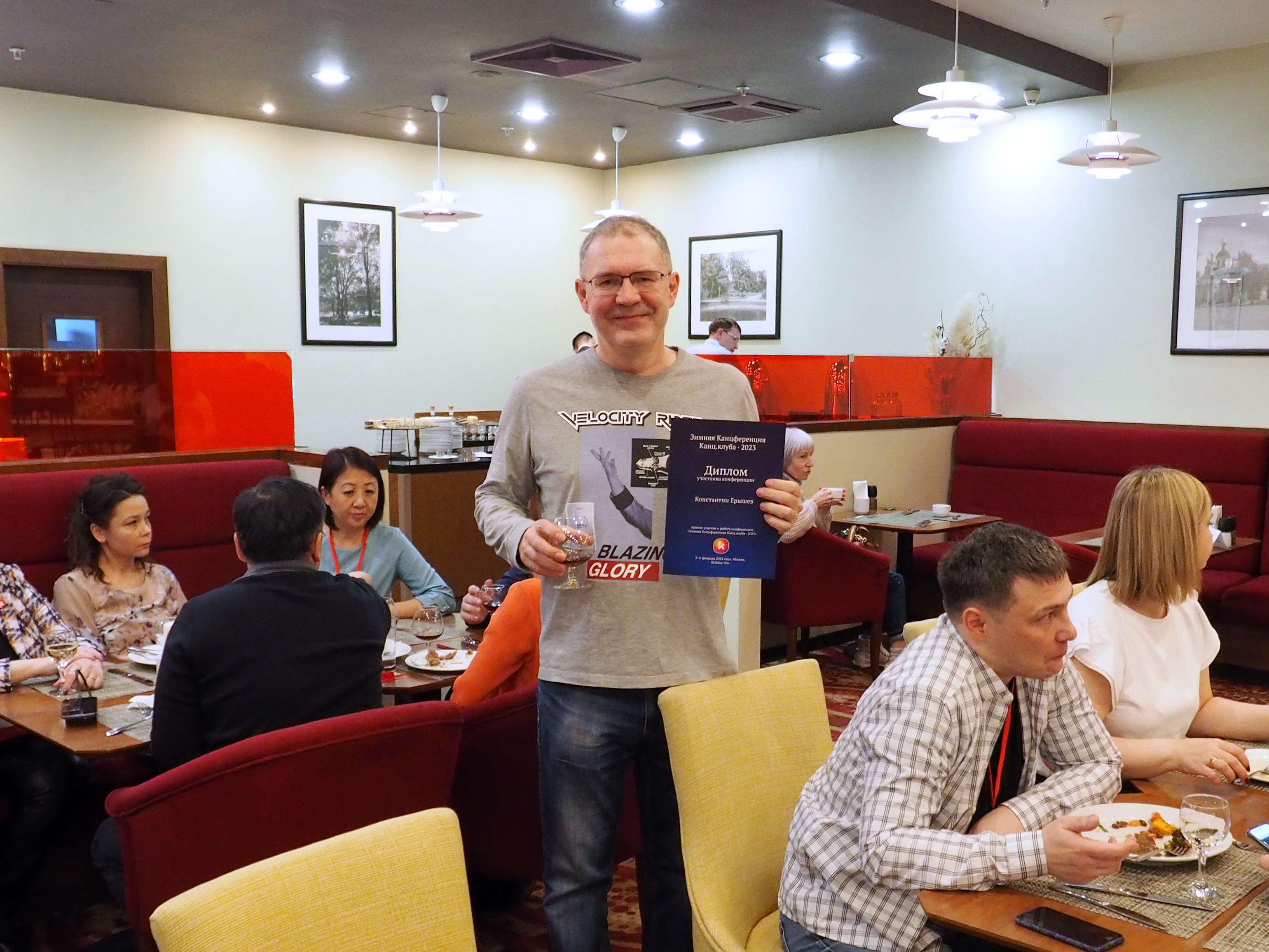 А потом, всё по той же доброй традиции, участники конференции рассаживались группками за столиками и вели неспешные беседы, кто мог, конечно. Чем дальше от Москвы место жительства канцелярщика (в сторону востока, понятное дело), тем дольше он добирался, сильнее уставал и тем раньше выбывал из стройных рядов. До конца оставались самые стойкие, «рядом живущие» москвичи))…