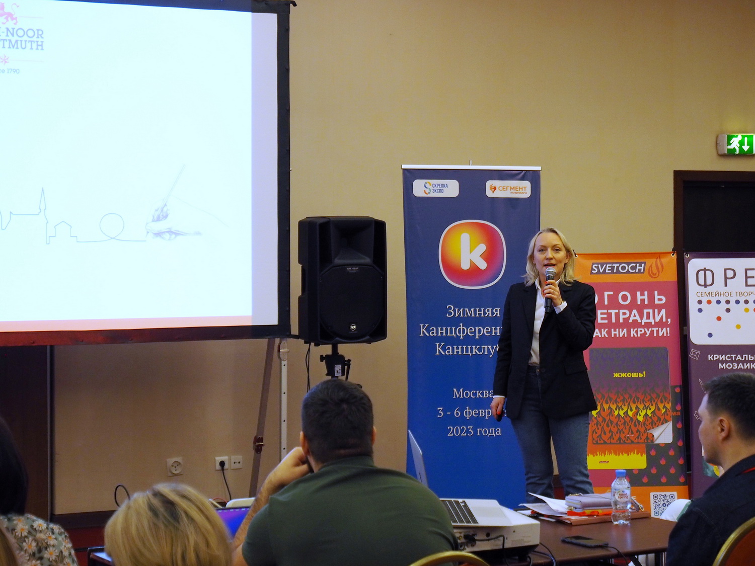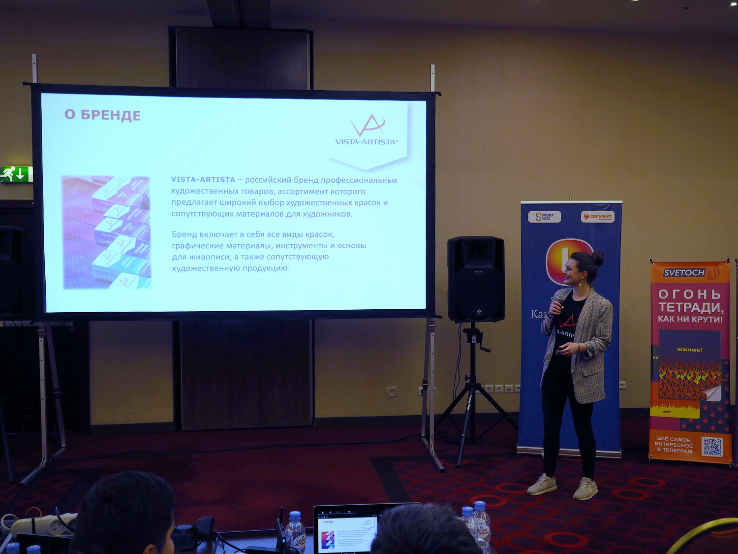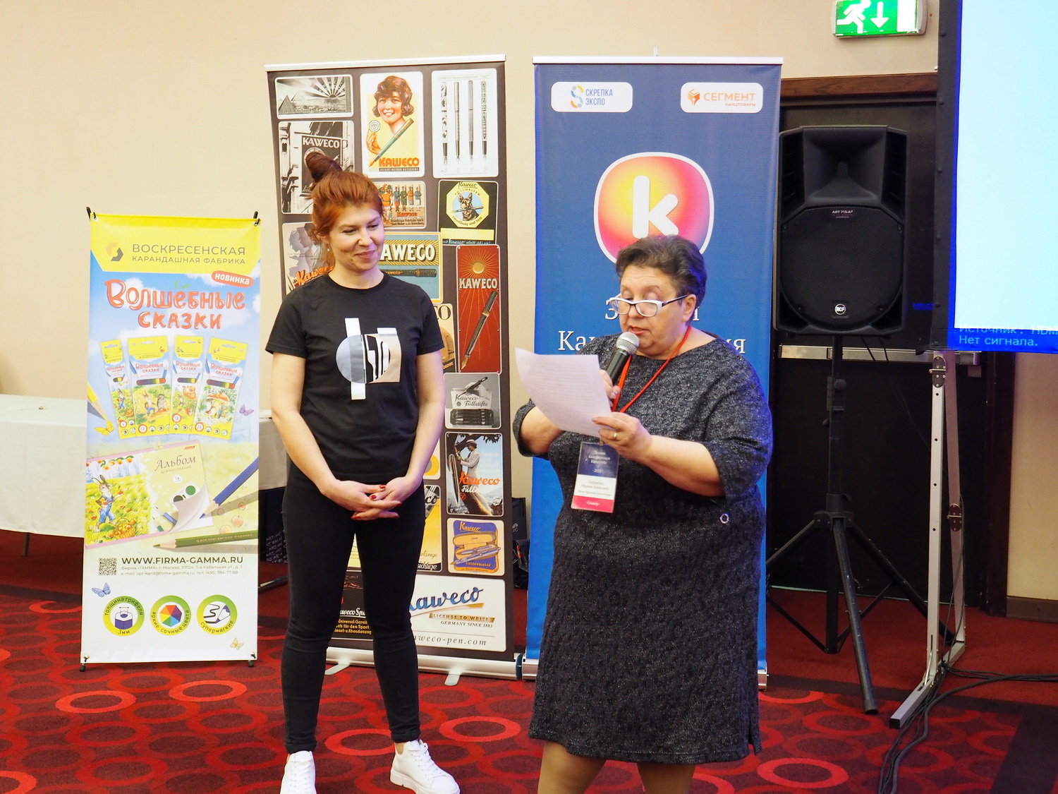 Отдельно хочу выделить… Да что хочу — выделяю выступление особенного спикера — Марины Борисовны Сидоренко, основателя проекта «Школа продавца канцелярских товаров». Она великолепна, кроме шуток. Между выступлениями представителей брендов, аккурат после обеда, была вставка с особой презентацией этой школы.