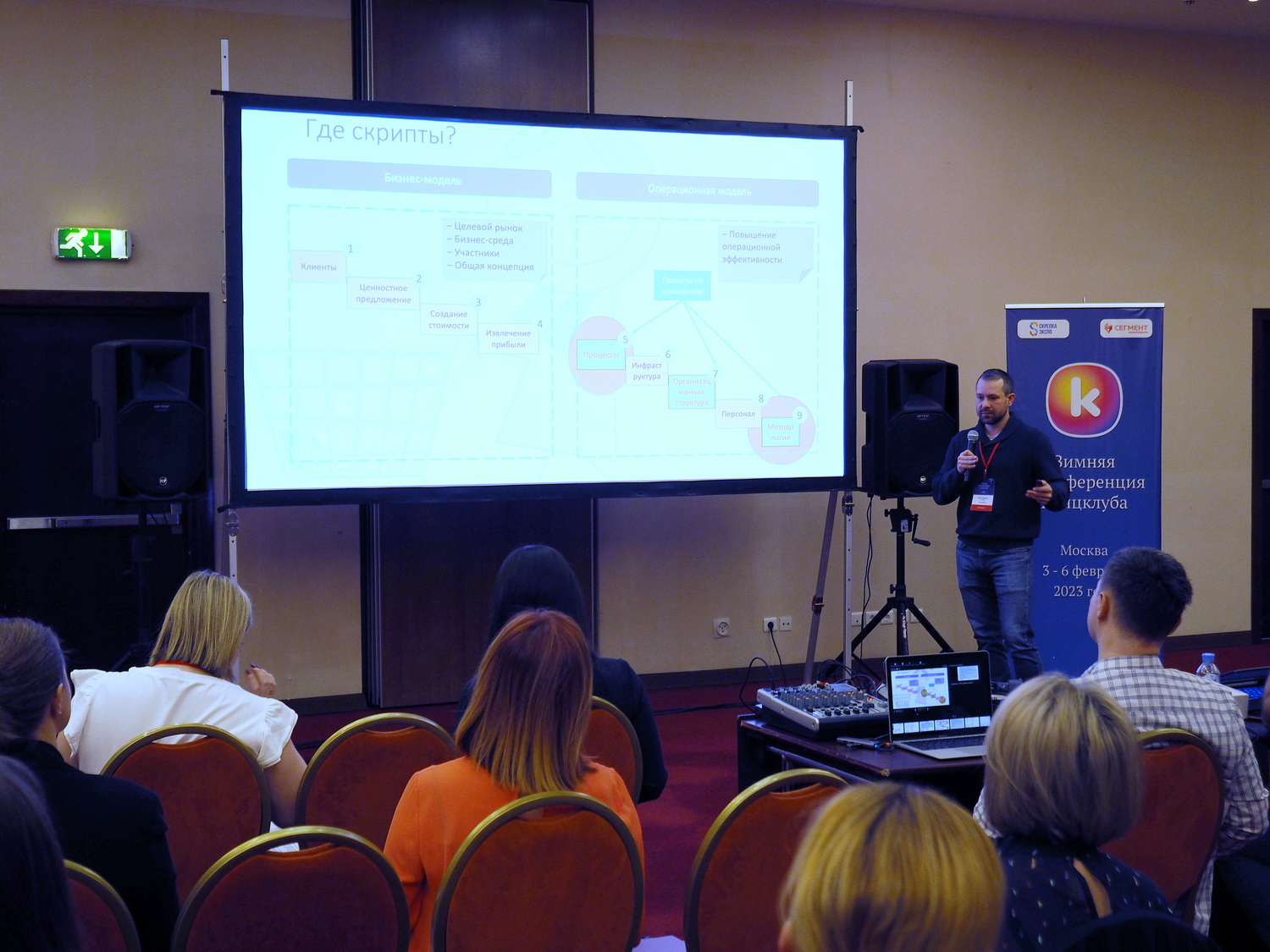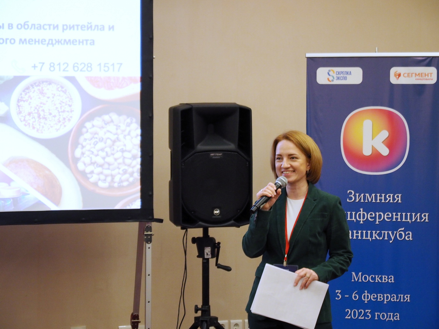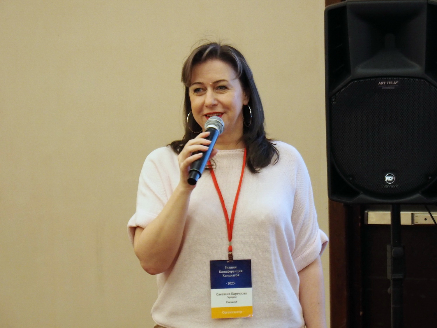 Первым спикером «Зимней Канцференции — 2023» стала Ася Барышева с темой «Скрипты: важный инструмент повышения продаж от 30 до 300 %». Ася — известный и успешный бизнес-тренер и консультант по продажам, автор тематических книг. В своём выступлении она много рассказывала о скриптах, учила их составлять и приводила примеры использования. В конце Ася поделила слушателей на команды и устроила весёлые соревнования с заданиями, в качестве приза победители получили её книги.