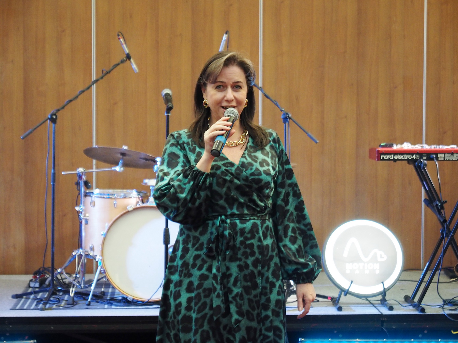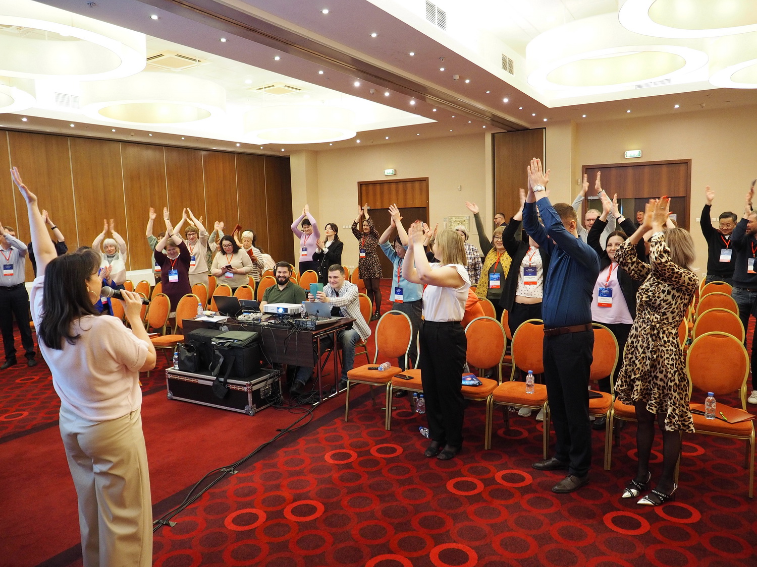Марина Борисовна с лёгкостью расшевелила засидевшуюся и разомлевшую после еды аудиторию весёлой зарядкой.