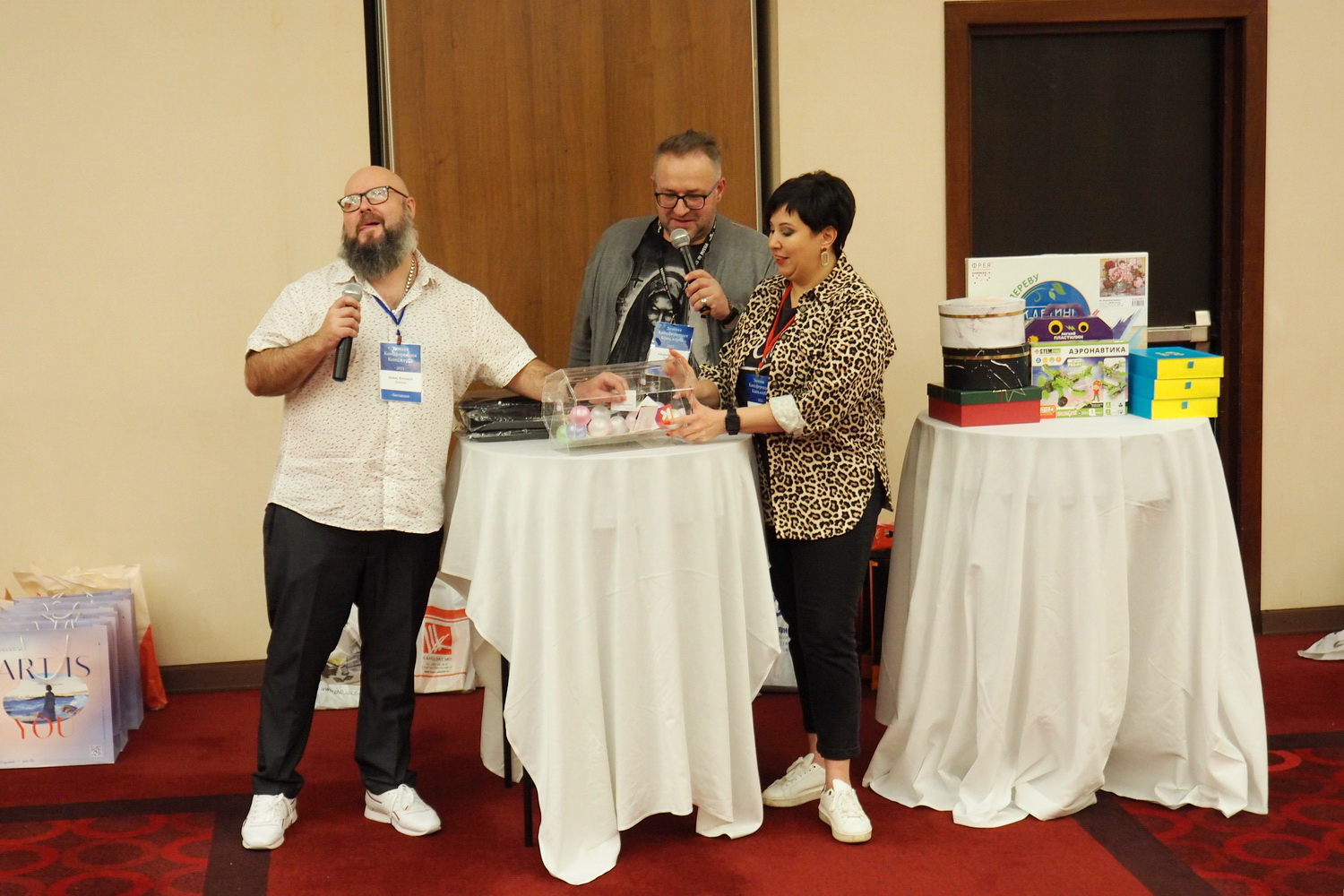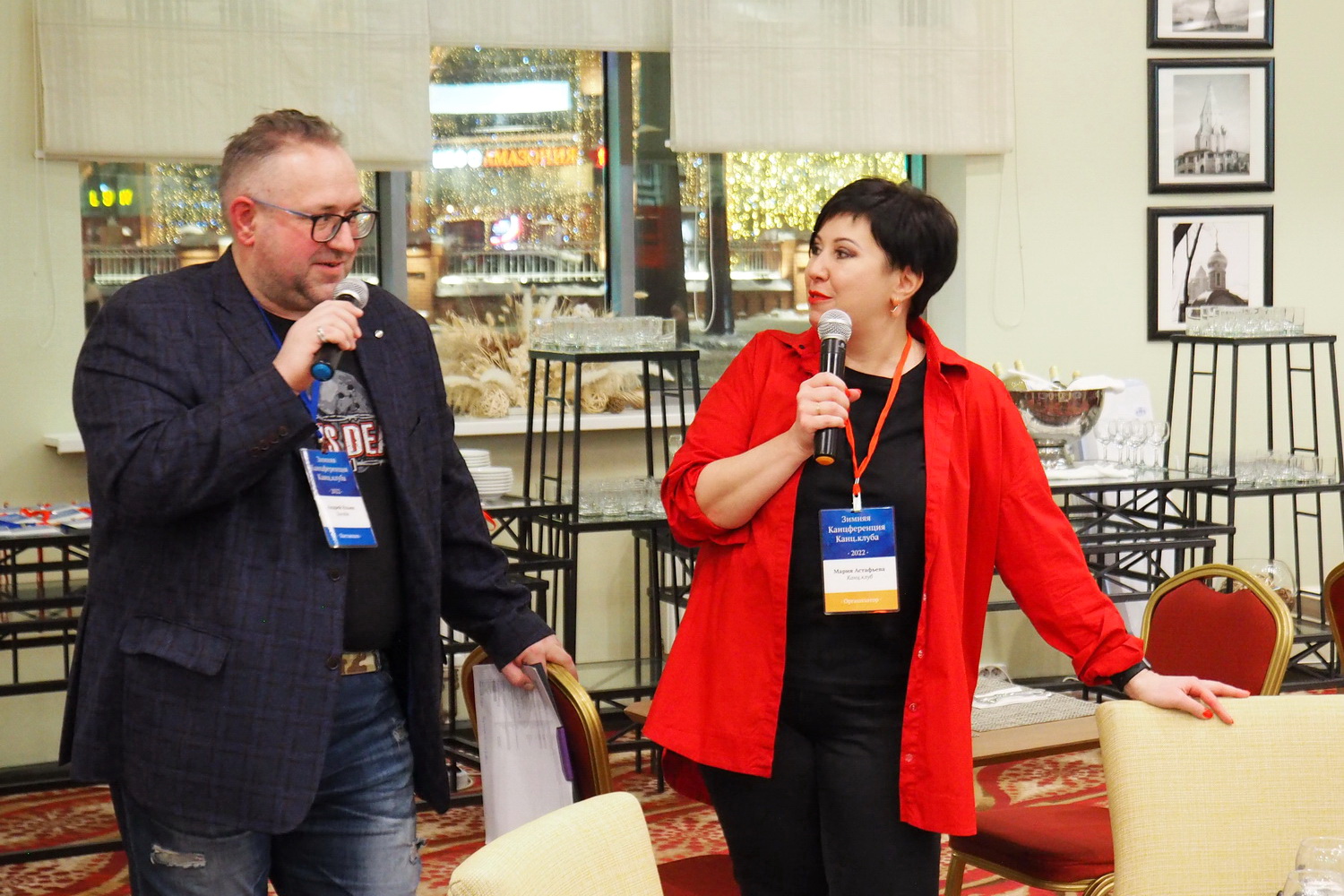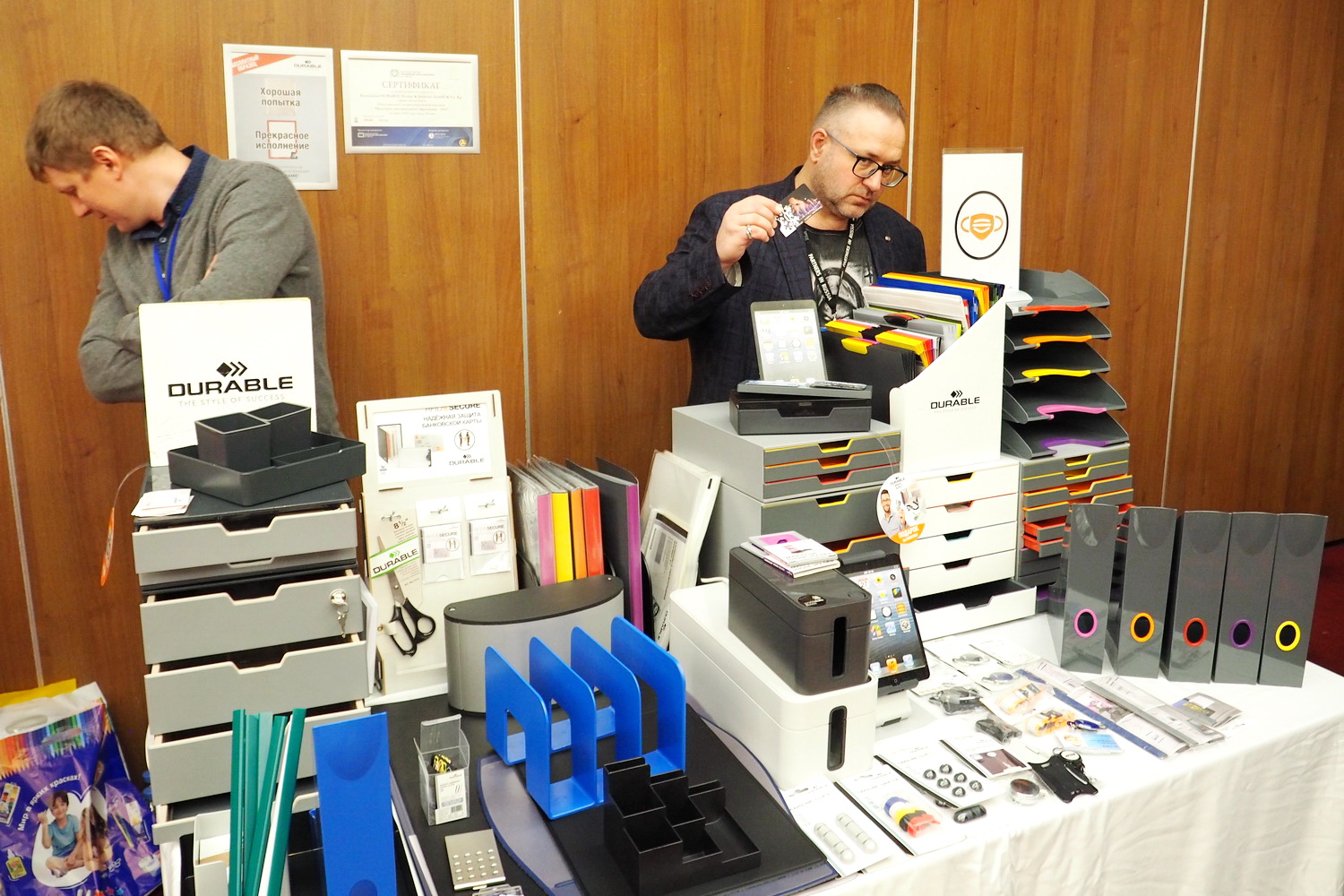 Ведущие конференции — известный в узкий кругах канцелярский гуру Андрей Ильин (Durable) и канцелярская инста-дива Мария Астафьева (сеть магазинов «Деловой») заводили аудиторию, выводили на эмоции и контакт. От них звучали приветственные слова к участникам и благодарности спонсорам.